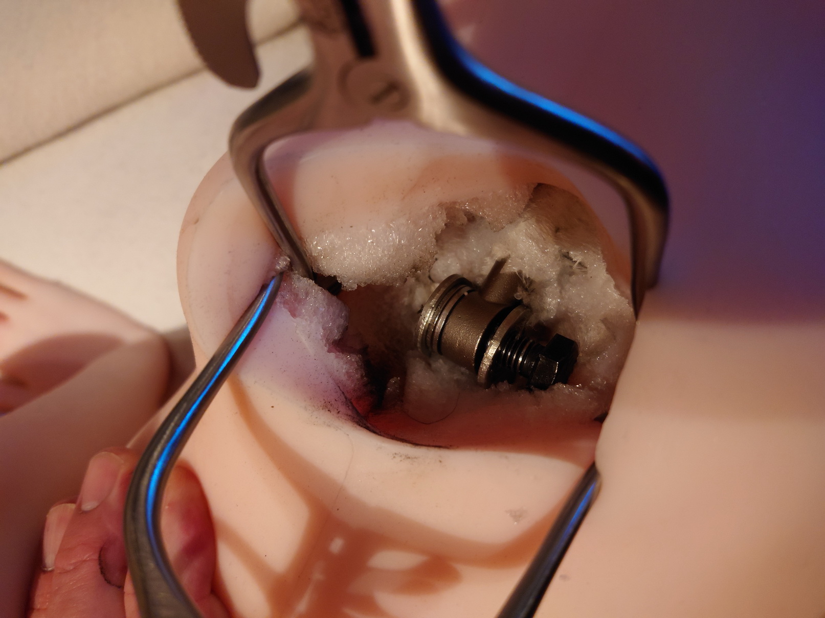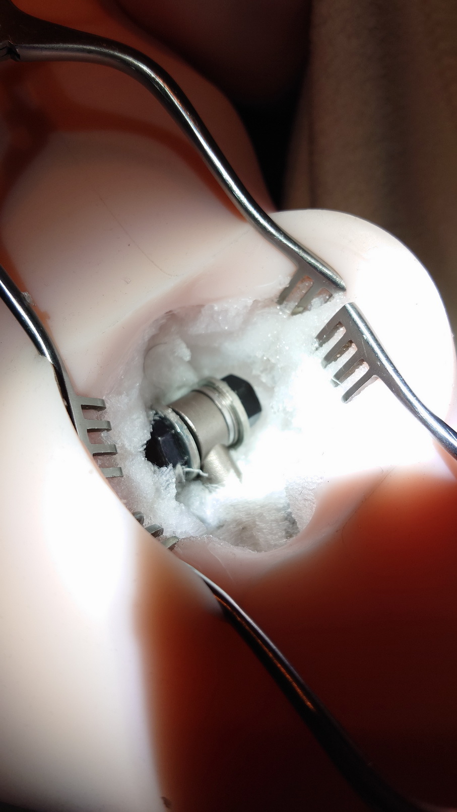 Das Hüftgelenk hatte sich nach einem knirschenden Geräusch immer mehr gelöst und hatte sogar laterales Spiel. Also Hüfte geöffnet und nachgesehen.