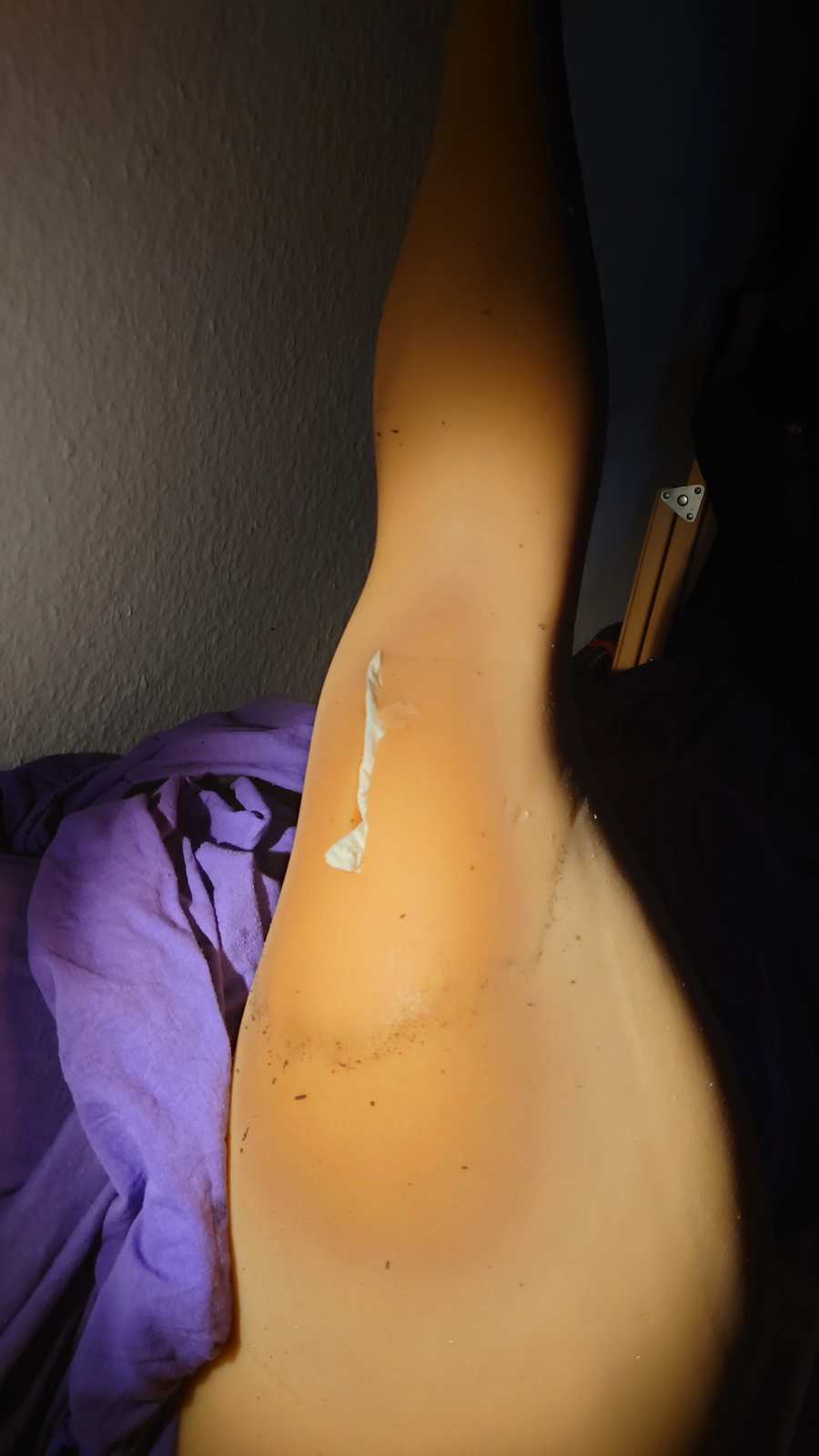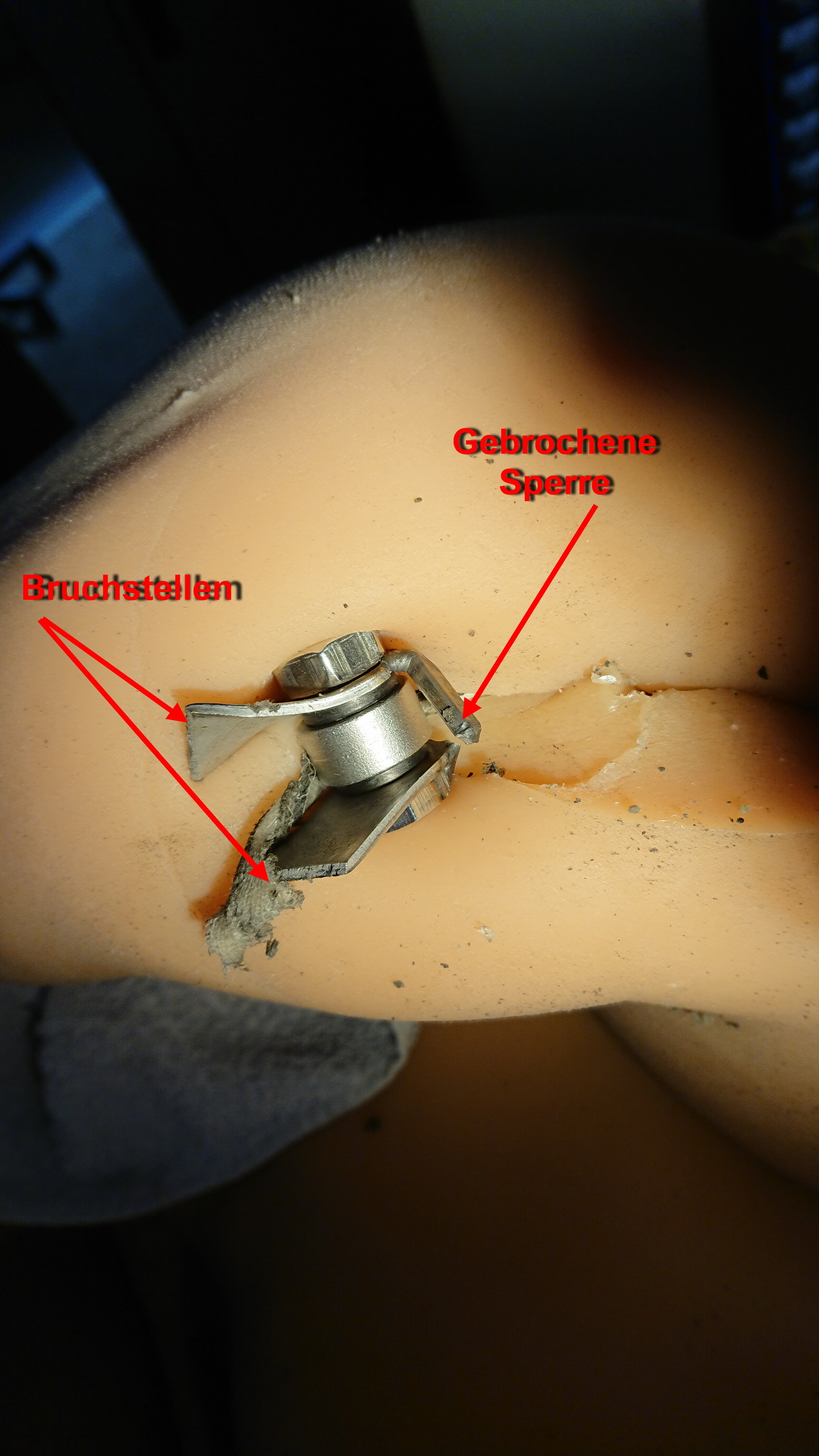 Das Knie ist das wohl am stärksten belastete Gelenk, ob im Stehen, beim Fotoshooting oder beim „Bestimmungsgemäßen Gebrauch„. Hier sehen wir ein gebrochenes Gelenk. In der Regel bricht zuerst die Sperre, das schwächt das Gelenk mehr und nach einer Zeit bricht das Gelenk komplett auseinander.