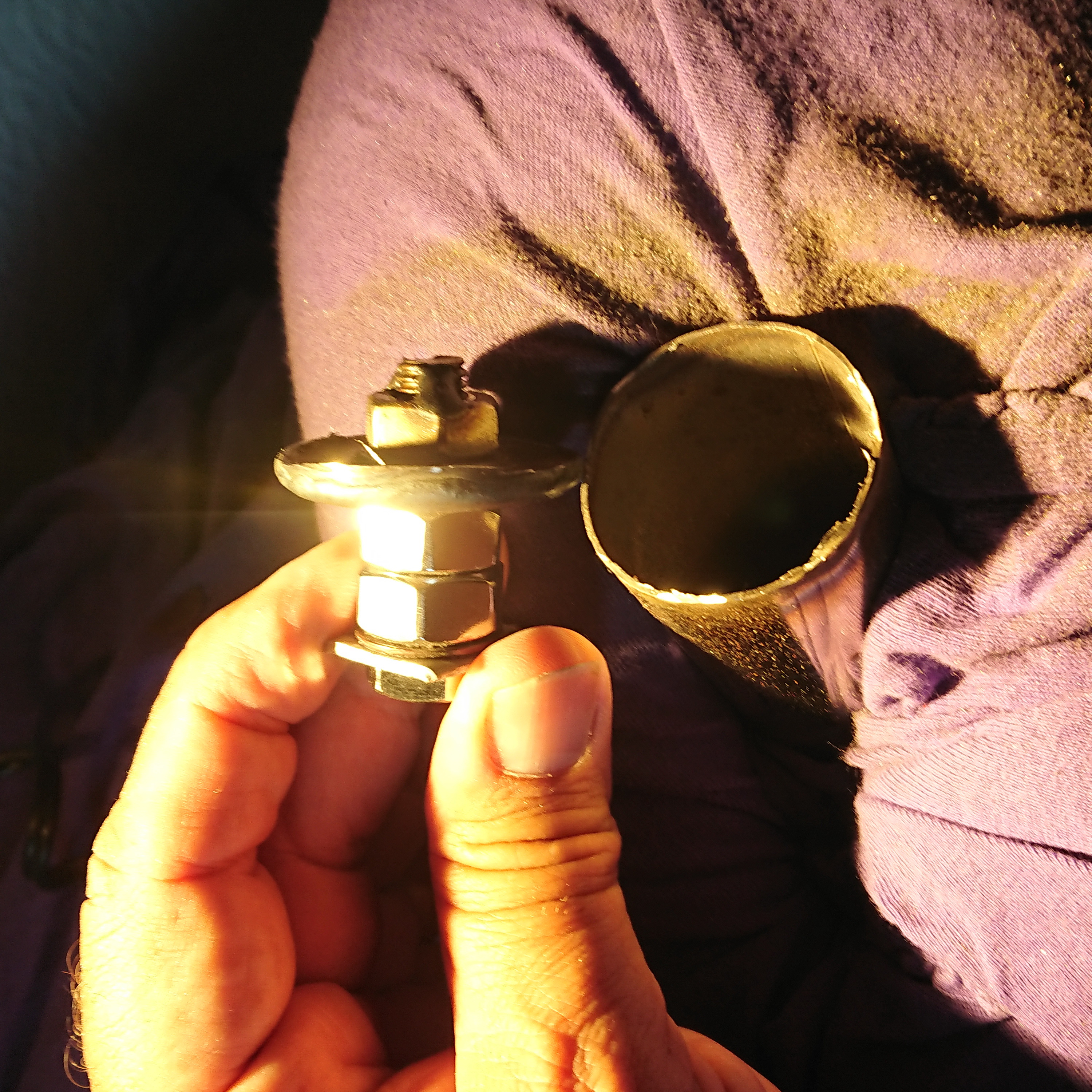 Das verbliebene Stück des Gelenkes ist samt Deckel auf das Oberschenkel-Rohr geschweißt. Um das zu erneuern muss der Deckel vom Rohr abgetrennt werden. Mit einer kleinen Trennscheibe kein Problem.