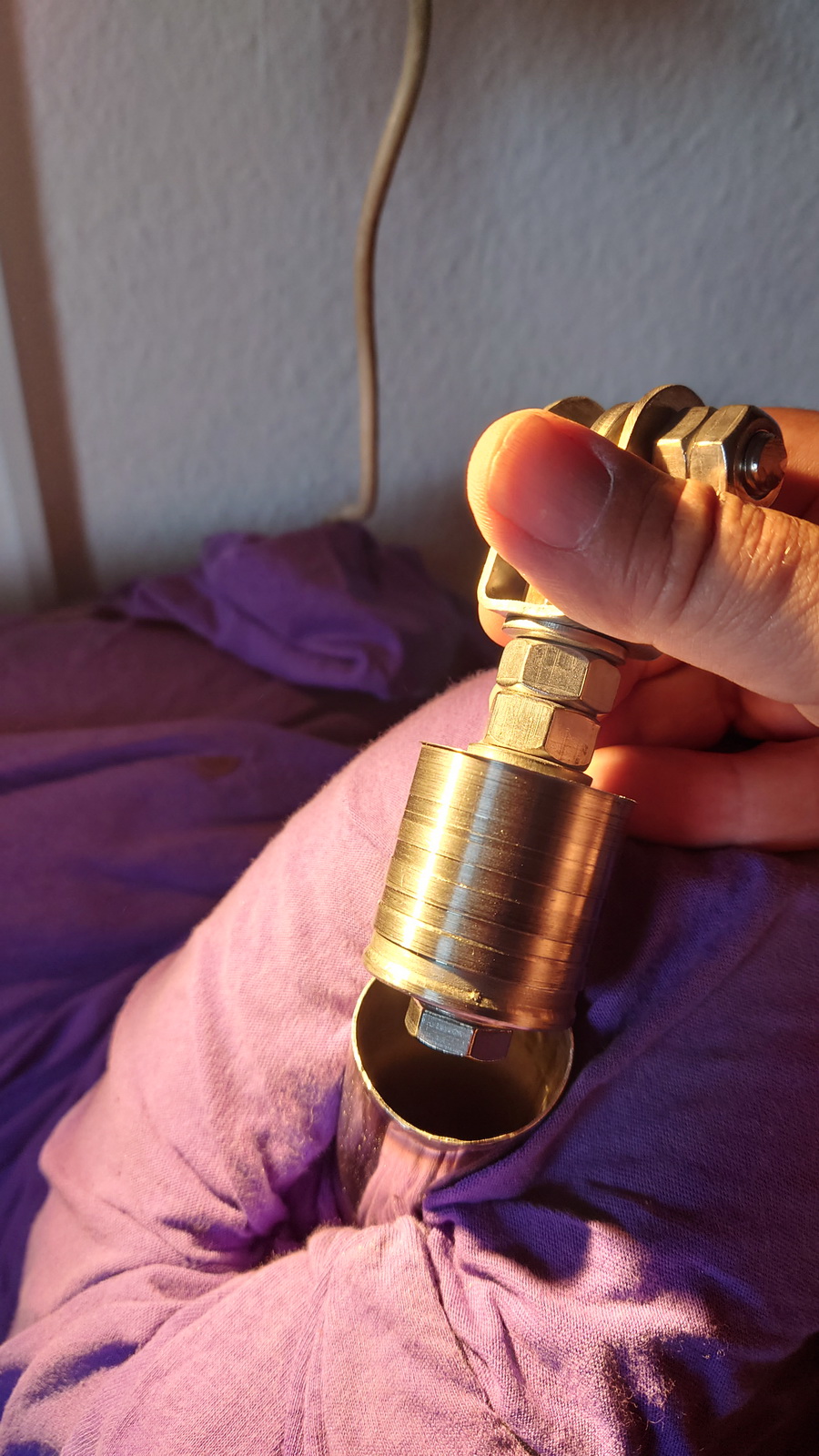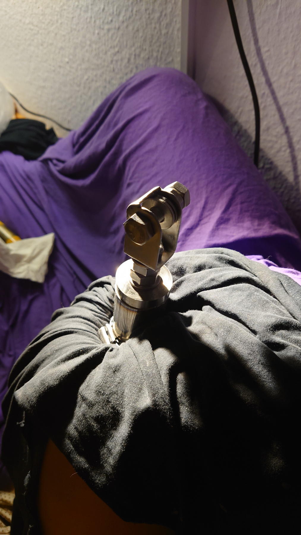 Ein neues Gelenk muss angefertigt werden. Es ist zu empfehlen die alten Federringe gegen Tellerfedern auszutauschen. Bis auf das zylindrische Drehstück ist alles aus Edelstahl. Das Gelenk wird in das Rohr gesteckt und mit Flüssigmetall verklebt.