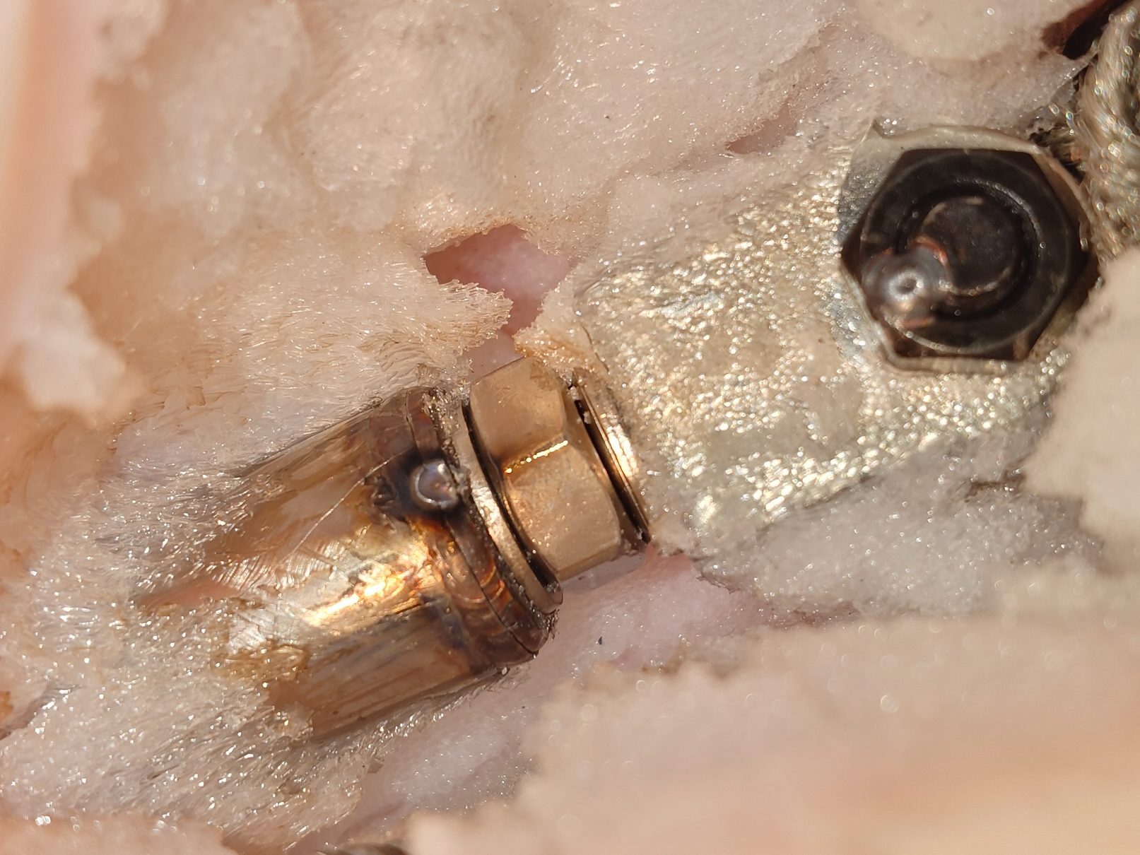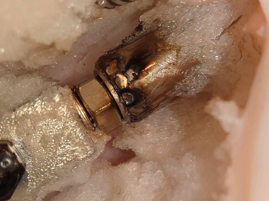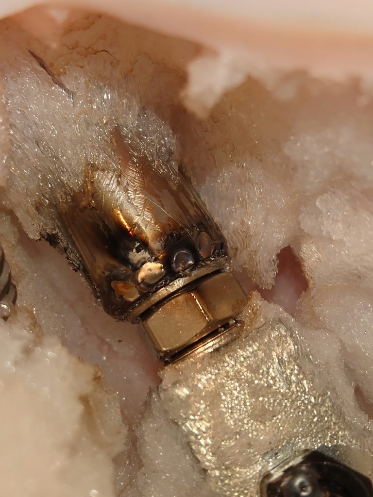 Das Rohr hat sich von seiner Grundplatte gelöst. Hier sind die Schweißpunkte gebrochen.