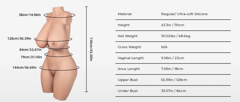 Bedenke jedoch stets ihr Gewicht. Sie zu bewegen, ob für eine Stellung oder die Pflege, ist immer mühsam. Der Begriff „Sexspielzeug“ ist hier nicht mehr angemessen. Mit einem Kopf und guter Pflege haben wir mit einer besonderen Teilkörper Liebespuppe zu tun.