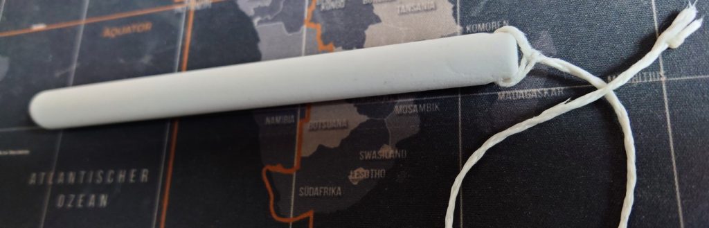 - Achtung: Der Vaginalkanal ist sehr tief. Ich schätze knappe 30cm. Der Stick ist zu kurz. Am letzten Zentimeter des Sticks ein Loch durch Bohren und ein Band zum Herausziehen anbringen. Die hintere Kante des Sticks etwas rund schleifen.
