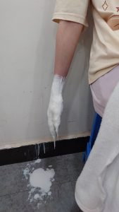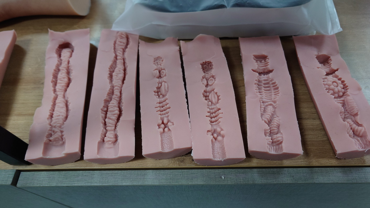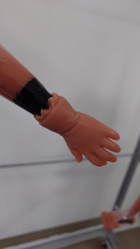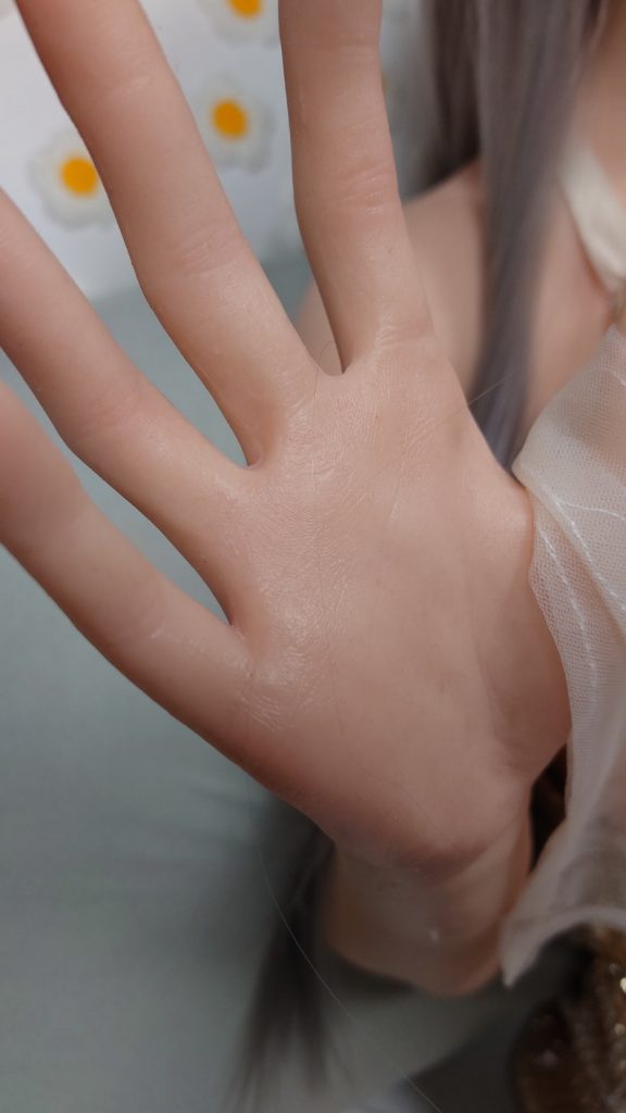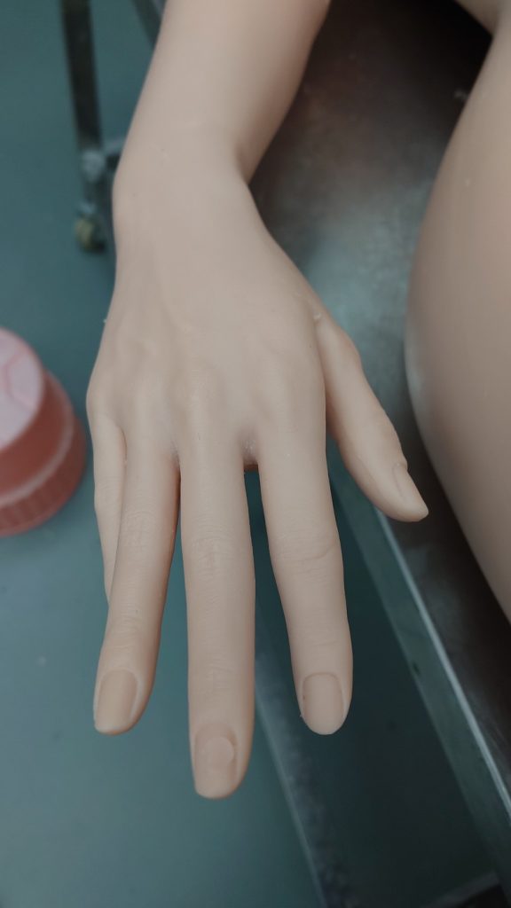 Die Hand wird mit einer Art Silikon Abdruckmasse überzogen und muss so trocknen. Wenn es sich verfestigt hat, hat sie alle feinen Poren, Falten und Texturen der Hand angenommen. Das ist auch der Grund warum die MMX Dolls so wunderschöne und realistische Hände haben.