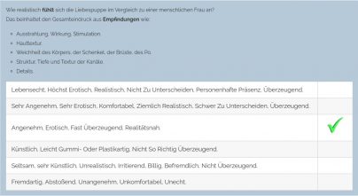 - Gefühlsechtheit: Wie nah ist das sexuelle Erlebnis mit der Puppe an der Realität? (Skala 1-10: Je höher, desto echter)