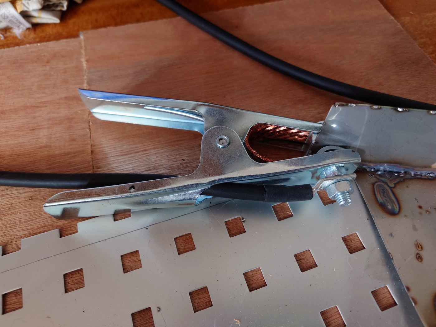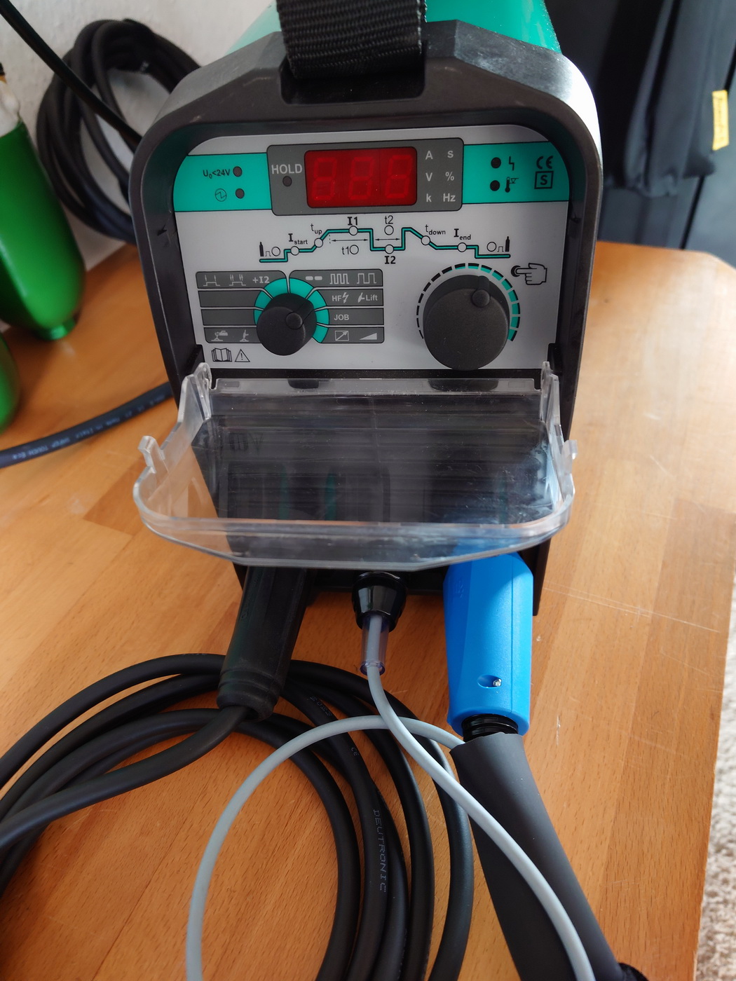 Die Masseklemme ist sehr kräftig. Der Brenner liegt gut in der Hand und ist leicht. Der Gas- und Stromanschluss ist hinten, Masse und Brenner wird vorne angeschlossen. Das Bedienfeld ist von einer durchsichtigen Haube geschützt.